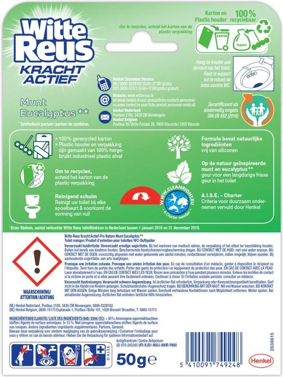De Witte Reus Pro Nature toiletblokken bestaan uit een gerecyclede verpakking en houder. Daarnaast ondersteunt Pro Nature de Plastic Bank, een sociale onderneming die het plastic in de oceaan wil verminderen en kansen biedt aan mensen in armoede. Het karton en de houder van de toiletreiniger zijn gemaakt van 100% gerecycled plastic en karton en zijn 100% recyclebaar. Om te recyclen, scheid het karton van de plastic verpakking. Probeer naast Witte Reus Pro Nature Munt Eucalyptus, nu ook Witte Reus Pro Nature Grapefruit. De toiletblokken die zorgen voor een schoon toilet!